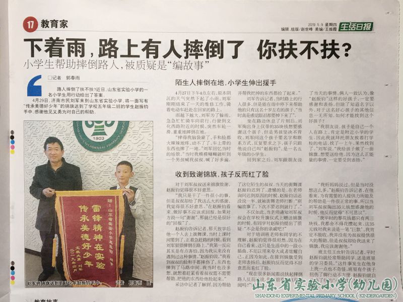路人摔倒了扶不扶?近日,山東省實驗小學的一名小學生用行動給出了答案。