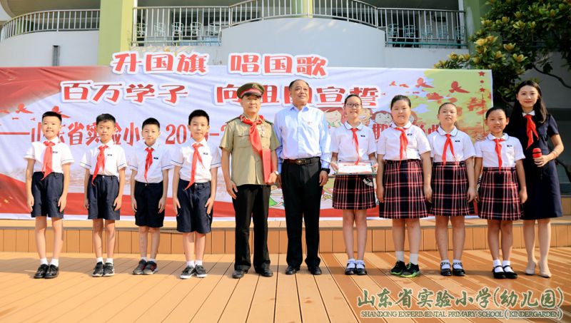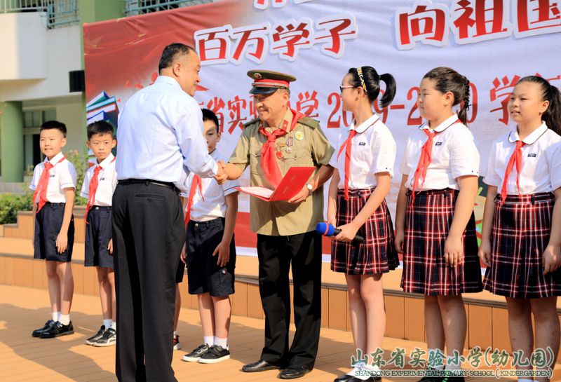 在剛剛結束的這個暑假里,全校1200多名隊員、98個雛鷹小隊行動起來,開展了“尋祖國70年建設者 爭做小小追夢人”紅領巾尋訪活動。在今天國旗下講話環節,作為全校尋訪活動的代表,來自五年級的一支雛鷹小隊邀請他們尋訪的榜樣一同來到典禮現場,分享尋訪故事,感受榜樣力量。校(園)黨總支副書記、副校長(副園長)李波為榜樣代表引灤入津工程參與建設者張陸頒發聘書作為我校少先隊課外輔導員,并向在尋訪活動中表現優秀的雛鷹小隊頒發證書以茲鼓勵。隨后,一曲《少年中國強》,一段精彩的團體武術表演,展現出新時代少年昂揚向上的精氣神。