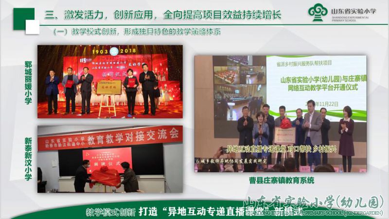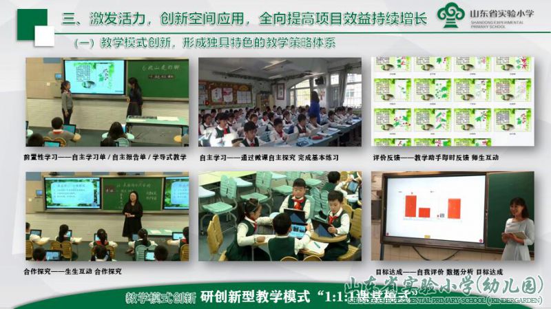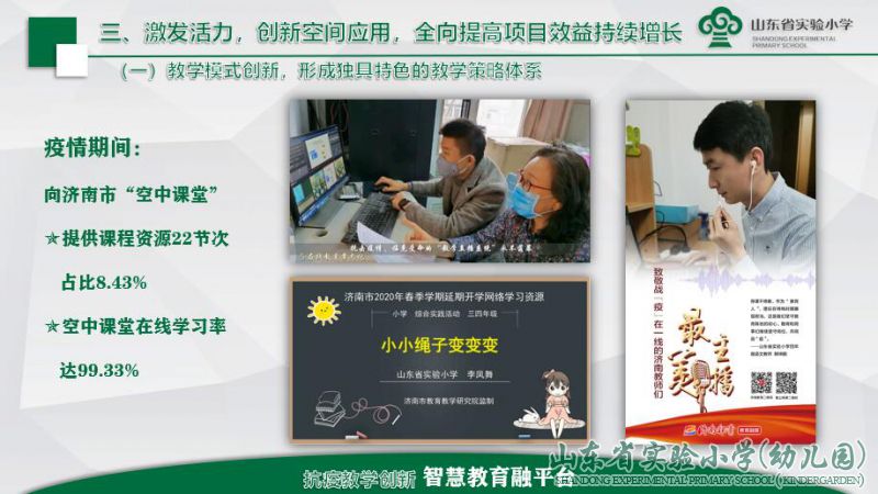 研發應用了“1:1:1課堂模式”,不斷錘煉出獨具學科特色的創新型教學模式;打造“異地互動專遞直播課堂”;疫情期間,向濟南市“空中課堂”提供課程資源22節次,歷下總比8.43%,全校學生在線學習率達99.33%,組織教師線上培訓6次,直播財智先鋒助成長系列課程5節,主題升旗儀式5次。