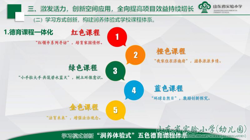 加快實施德育課程一體化,創建“八大學習中心”,形成“潤養體驗式”五色德育課程體系;充分利用“一對一智慧學堂”,探索基于“電子書包”環境下的學生核心素養發展途徑;遍布各處的數字閱讀終端與空間閱讀相結合;引進“山東省人工智能教育教學與監測平臺”,利用創客空間開展人工智能教育課程開發和面向STEM教育的信息技術學科實踐研究。