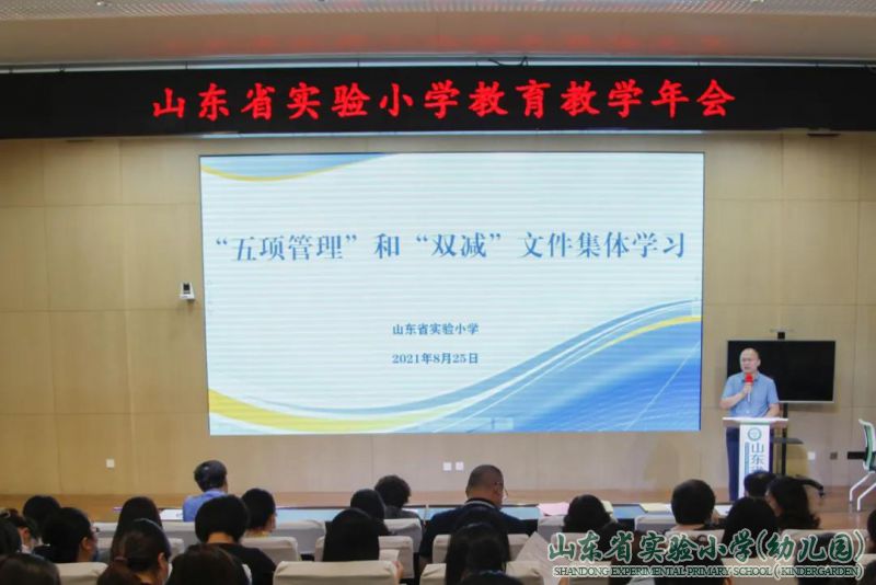 為貫徹落實(shí)中辦、國辦印發(fā)的《關(guān)于進(jìn)一步減輕義務(wù)教育階段學(xué)生作業(yè)負(fù)擔(dān)和校外培訓(xùn)負(fù)擔(dān)的意見》,深入領(lǐng)會(huì)國務(wù)院教育督導(dǎo)委員會(huì)辦公室《關(guān)于開展 “五項(xiàng)管理”實(shí)地督査工作的通知》精神,聚焦減負(fù)提質(zhì)的工作目標(biāo),2021年8月25日,山東省實(shí)驗(yàn)小學(xué)召開了以“構(gòu)建教育良好生態(tài) 促進(jìn)學(xué)生全面發(fā)展”為主題的第二屆教育教學(xué)年會(huì)暨主題黨日活動(dòng)。學(xué)校領(lǐng)導(dǎo)、全體教師及合作學(xué)校教師代表參與活動(dòng)。