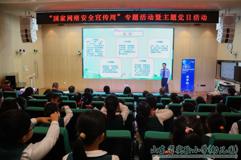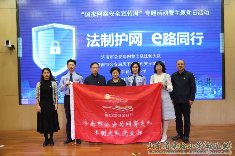 10月14日,濟南市公安局網警支隊法制大隊支部書記、大隊長任曉蕾、民警艾鵬走進山東省實驗小學,在“國家網絡安全宣傳周”的法治日里,為全校師生帶來了一場以《法制護網e路同行——網絡安全宣傳進校園》為主題的精彩講座。濟南市公安局歷下分局趵突泉派出所副所長董圓,我校校長、黨總支書記苗建,副校長、黨總支委員李篤強、鄭國棟參加活動。