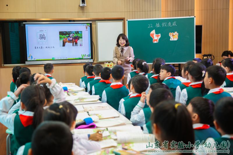 學校骨干教師代表孫文靜執教了二年級語文課《狐假虎威》。她通過創設情境的方式激發學生讀、思、答,讓一節妙趣橫生的課堂自然親切地展現在與會人員面前。孫老師以“看圖猜故事”的方式引出課題,讓課堂在學生激烈的搶答中拉開了帷幕。識字時,她引導學生借助形聲字、象形字等方法巧妙識記,提高了識字效率。根據本課的特點,孫老師注重朗讀訓練,指導學生通過抓住重點詞語,觀看課本插圖等方法來揣摩人物的想法、心情,從而讀好人物對話。最后還別出心裁地設計了“森林劇場”,學生入情入境的表演讓線上線下回蕩起一陣陣歡聲笑語。