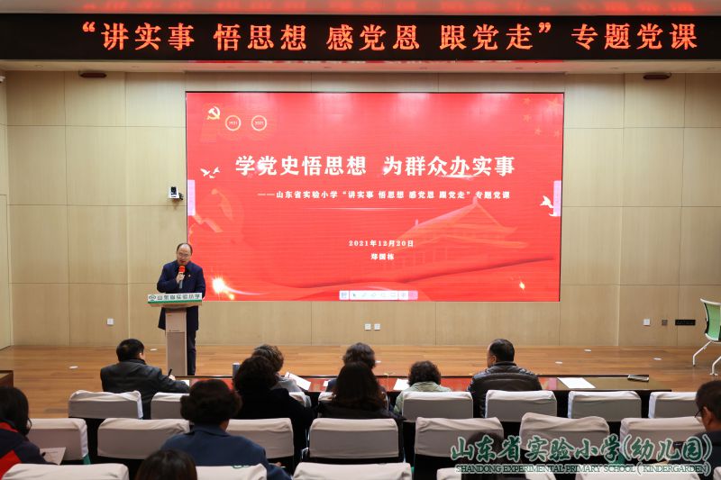 接下來,第一黨支部書記鄭國棟同志帶來了一堂以“學黨史悟思想為群眾辦實事”為主題的專題黨課。鄭國棟從“賡續(xù)血脈學黨史,打造特色黨建品牌”“凝心聚力悟思想,團隊引領(lǐng)快速成長”“黨建引領(lǐng)辦實事,奉獻有溫度的教育”“聚焦發(fā)展開新局,創(chuàng)新實踐解決難題”四個方面匯報了在黨建的引領(lǐng)下,學校各項工作取得的突出成績,報告承諾的辦實事實踐活動進展情況。他強調(diào)要通過黨史學習教育,進一步加強教師隊伍建設(shè),明確“五項管理”“雙減”等政策要求,以家長學校建設(shè)引領(lǐng)家校合作,增強育人合力,推動學校教育的高質(zhì)量發(fā)展,進一步密切聯(lián)系服務(wù)群眾,積極主動辦好為民實事。