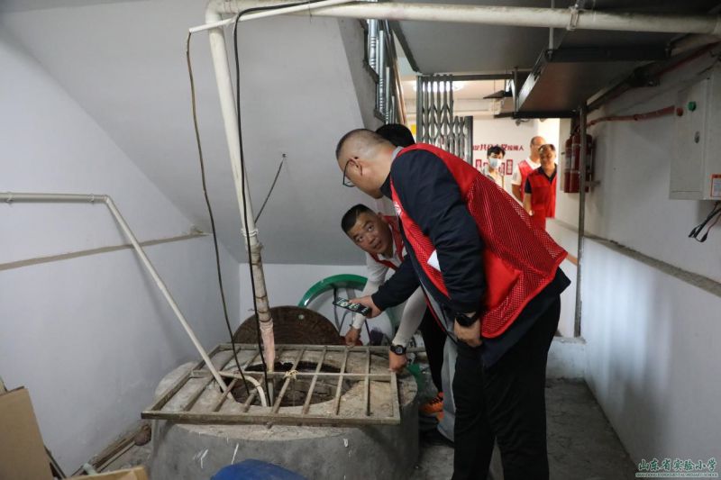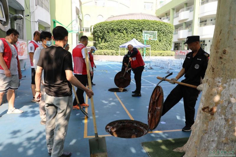男教職工迅速到達(dá)進(jìn)入教學(xué)樓地勢較低位置,第一時(shí)間采取防汛措施,搬運(yùn)沙袋封住各個(gè)進(jìn)水口;快速打開井蓋,疏通管道,排出污水;檢查滲水井水位高度、滲水情況以及排水設(shè)施是否正常。
