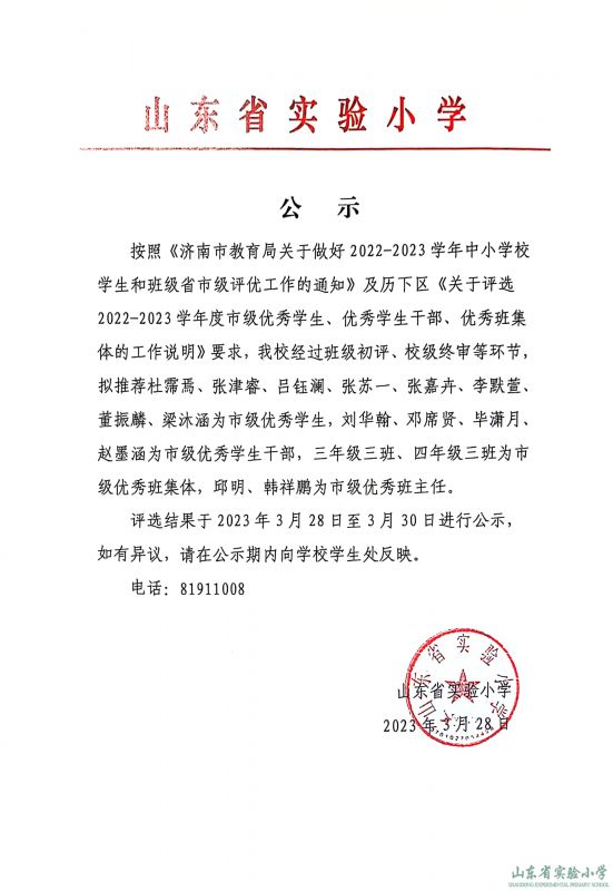 山東省實(shí)驗(yàn)小學(xué)擬推薦參加2023年度濟(jì)南市優(yōu)秀學(xué)生、優(yōu)秀學(xué)生干部、優(yōu)秀集體名單公示