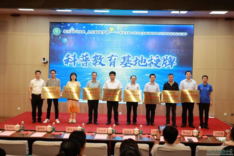 學校科普工作的推進,離不開家、校、社、企的通力合作。儀式上,中國首批航天員趙傳東,山東省教育科學院黨委書記、院長孫啟高為與學校長期合作的館、校、企業單位:山東省科技館、山東省青少年宮、山東省雛鷹少先隊服務中心、濟南市科技館、山東建筑大學、山東省農業科學院蔬菜研究所、山東浪潮優派科技教育有限公司、騰訊云計算有限公司的相關領導授牌。