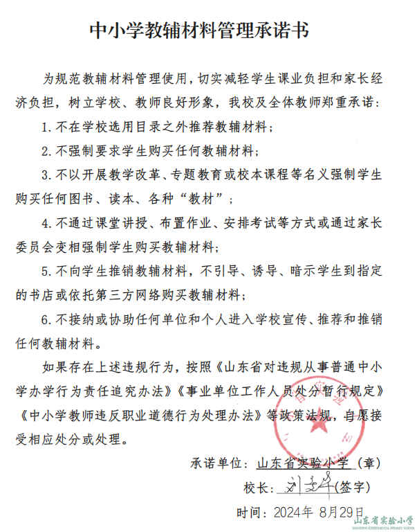 每學期初,教學管理部都嚴格按照制度要求,組織全體教師簽署教材教輔管理承諾書,規范教輔材料管理使用。